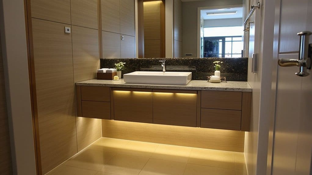 While enhancing your powder room’s ambiance, don’t overlook the subtle charm of warm under-cabinet lighting. It adds a cozy glow, highlighting countertops with a soft, inviting tone. Install LED strips (3000K color temperature) for energy efficiency and warmth, ensuring a 12-18 inch length per cabinet.