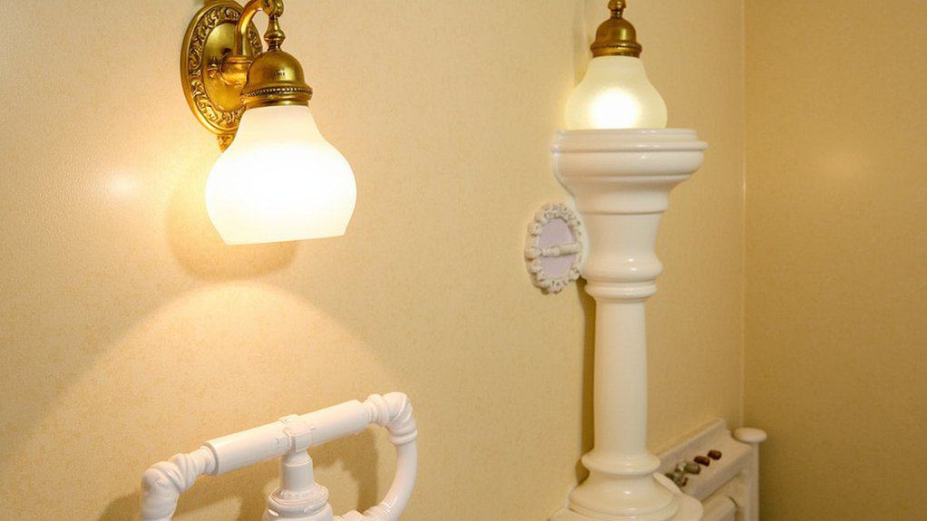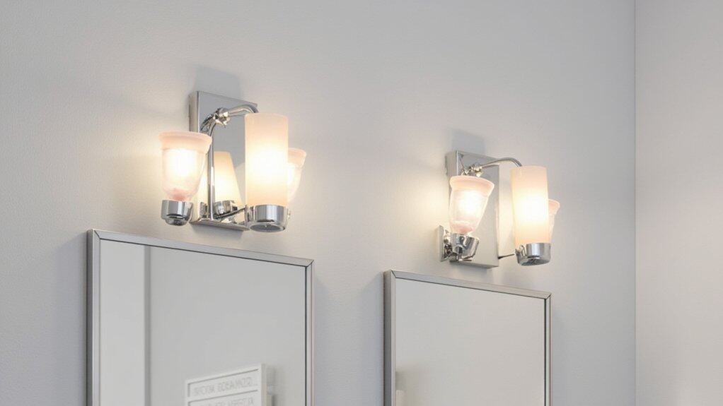 While updating your powder room, consider dimmable LED sconces to create a functional and stylish lighting setup. These fixtures, often 8-12 inches tall, offer adjustable brightness for any mood or task. Install them 60-66 inches above the floor near your mirror for ideal lighting.