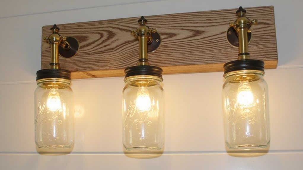 Moving from vibrant spotlights, let’s explore a charming option with rustic mason jar lights for your powder room. These fixtures bring a cozy, farmhouse vibe with simple materials you can customize. Hang them above the mirror or beside it for a warm glow.