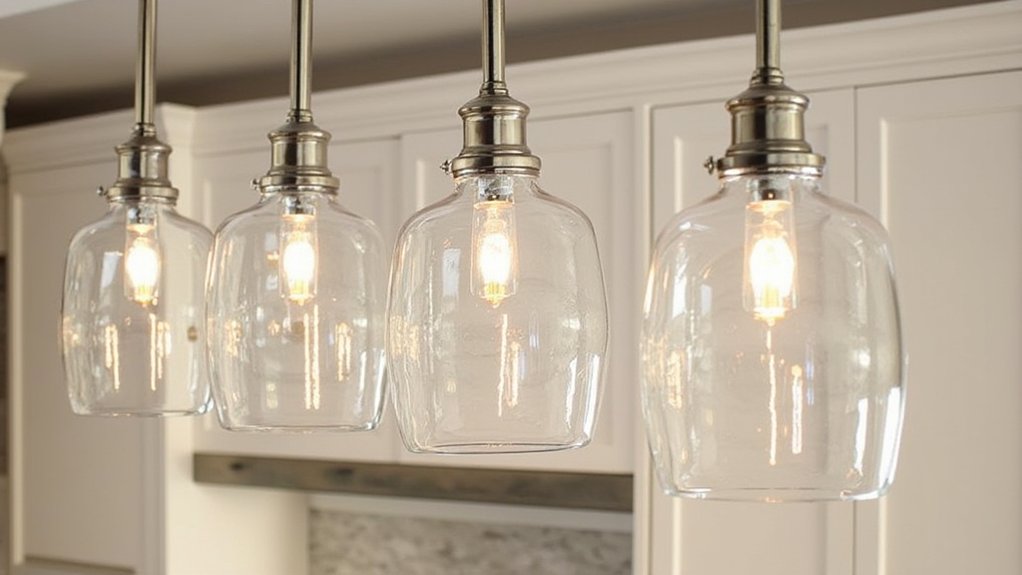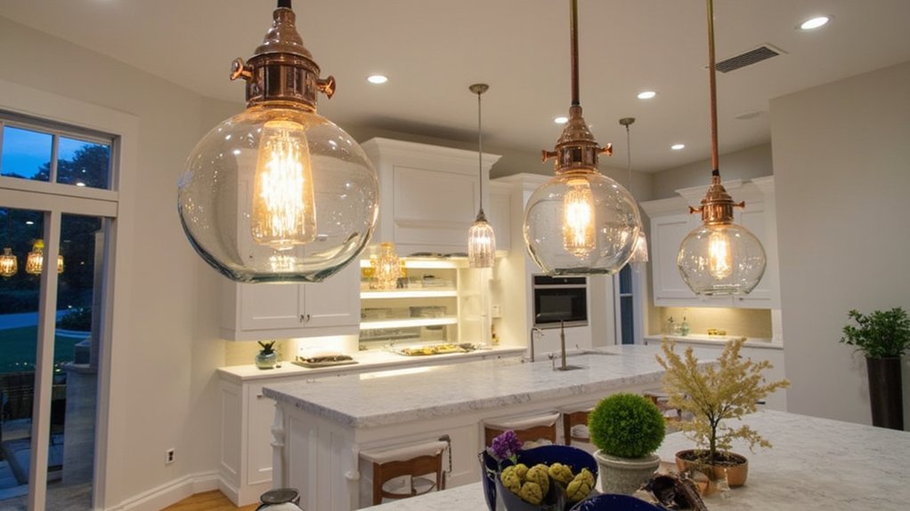 Let’s shift focus to another brilliant way to light up your kitchen with ambient island lighting. You can transform your island into a warm, inviting spot with the right fixtures. Hang pendant lights about 30-36 inches above the counter for ideal brightness, installing them every 2 feet for even glow.