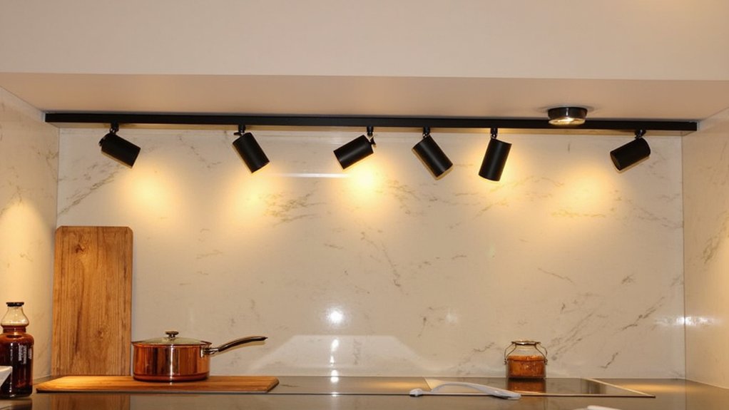 As you explore ways to brighten your kitchen, cozy track lighting offers a versatile and modern solution. It’s customizable, letting you direct light exactly where you need it most. Install a 48-inch track along your countertops for even illumination.