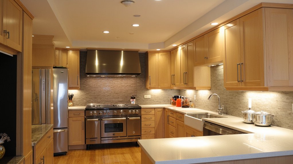 While under-cabinet strip lights target countertops, warm recessed lighting elevates your kitchen’s overall glow with subtle charm. You can install these lights into your ceiling for a cozy, inviting vibe. Use bulbs with a color temperature of 2700K to 3000K for warmth, spacing them 4-6 feet apart.