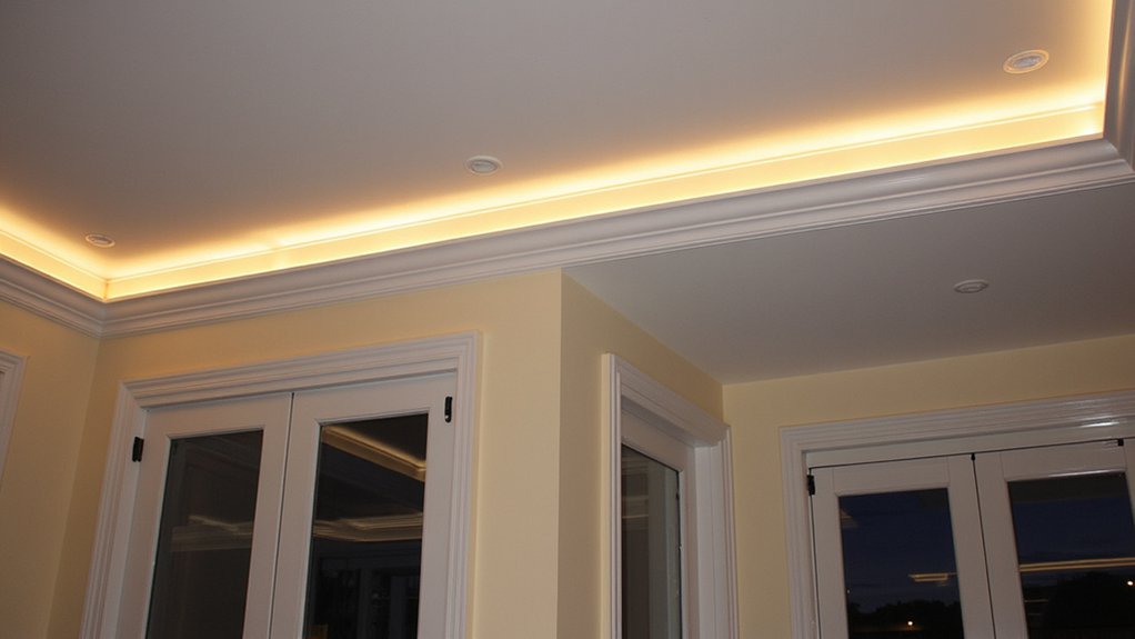 While vintage chandeliers steal the spotlight, let’s explore a subtler option with hidden cove lighting for your living room. This technique hides LED strips in ceiling recesses, creating a soft, indirect glow. You’ll transform your space with minimal effort.