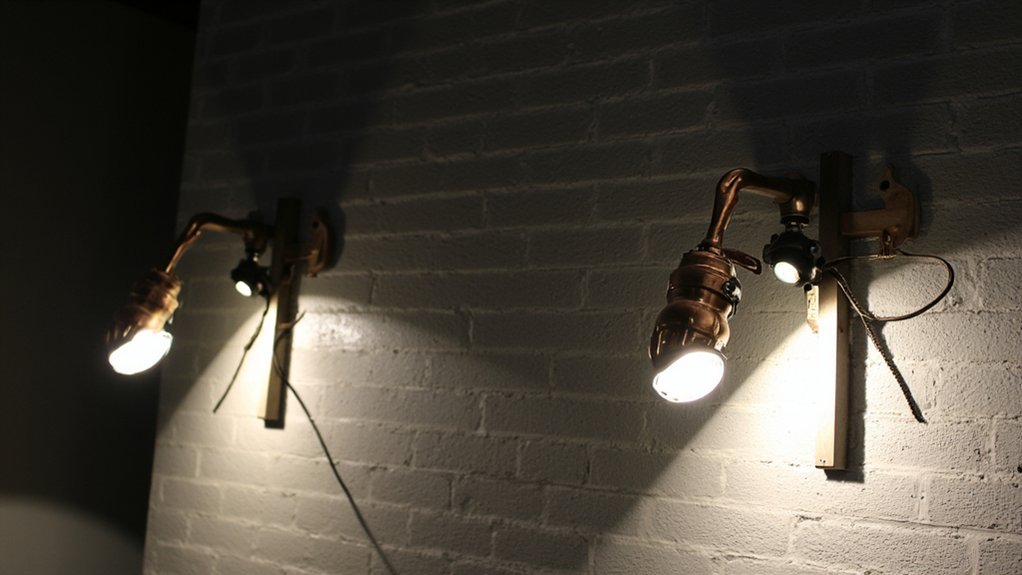 Moving from the charm of artistic table lamps, let’s explore industrial spotlight fixtures to add a bold edge to your living room. These rugged lights bring a factory vibe with raw metal finishes. You’ll love their focused beams, perfect for highlighting art or cozy corners.