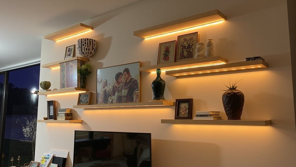 Switching from the subtle glow of hidden cove lighting, let’s explore under-cabinet mood lighting for your living room. You can create a cozy ambiance by installing lights beneath cabinets or shelves, highlighting decor with a soft glow.