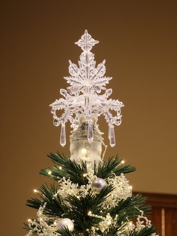 A frosted crystal tree topper serves as a stunning crown for Christmas trees, creating an ethereal glow as it disperses light throughout the space. The frosted glass detailing provides an elegant, wintry appearance while casting subtle shadows on the decorations below.