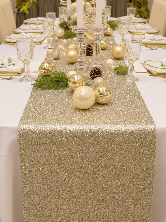 Glittering gold table runners can elevate a simple dining table into an eye-catching focal point during holiday celebrations. When combined with fine tableware, these shimmering decorative pieces create an upscale dining atmosphere that embodies festive elegance.