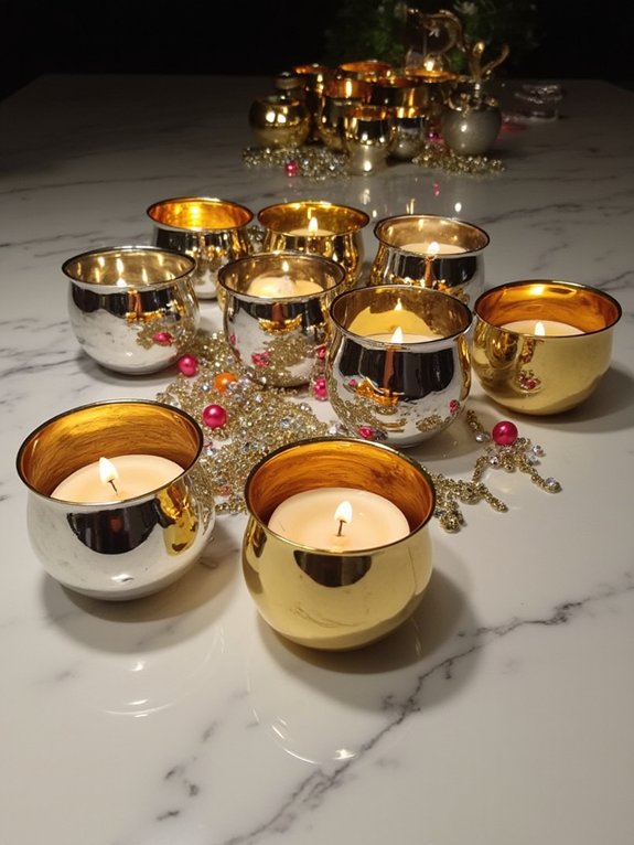 Metallic tea light displays combine warm candlelight with reflective metallic surfaces to create elegant holiday décor for tables and mantels. The shimmering interplay of light on metallic finishes transforms ordinary spaces into sophisticated environments while providing subtle illumination.