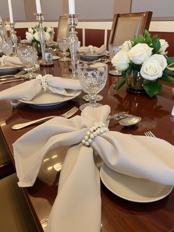 Pearl-studded napkin rings add elegance to holiday table settings through their delicate arrangement of pearls and shimmering accents. These decorative pieces transform standard napkins into sophisticated table elements while creating attractive light-catching focal points across the dining surface.