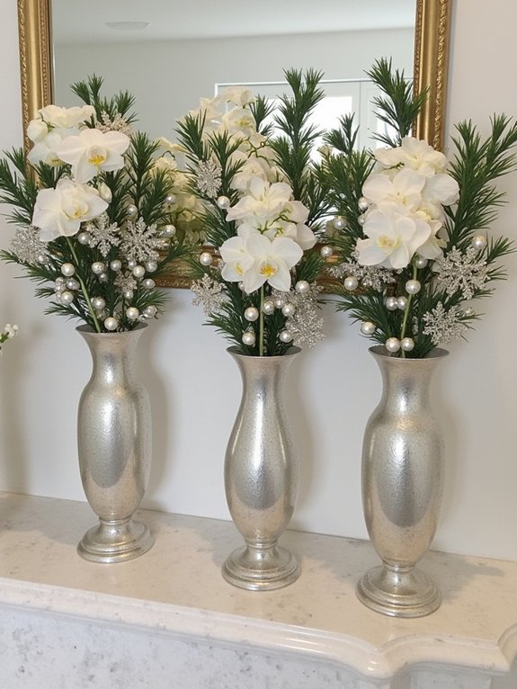 Silver mercury glass vases provide an elegant vintage touch to metallic holiday decor. Their reflective surfaces amplify light, creating a magical atmosphere that enhances festive table settings. When filled with seasonal flowers or decorative branches, these versatile vessels become stunning focal points.