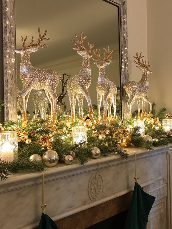 A bejeweled reindeer display adds glamour and enchantment to a holiday mantel through the strategic placement of crystal-adorned figurines. The centerpiece features a large reindeer flanked by smaller companion pieces, with shimmering ornaments and metallic garlands artfully arranged between them.