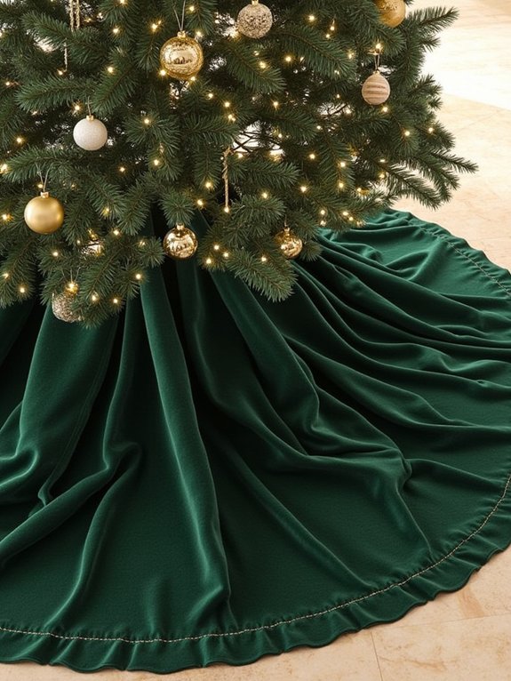 A velvet floor-length tree skirt serves as a luxurious foundation for holiday decor, combining deep colors and rich texture to create an elegant display beneath the Christmas tree. The premium fabric adds sophistication while concealing the tree stand completely.