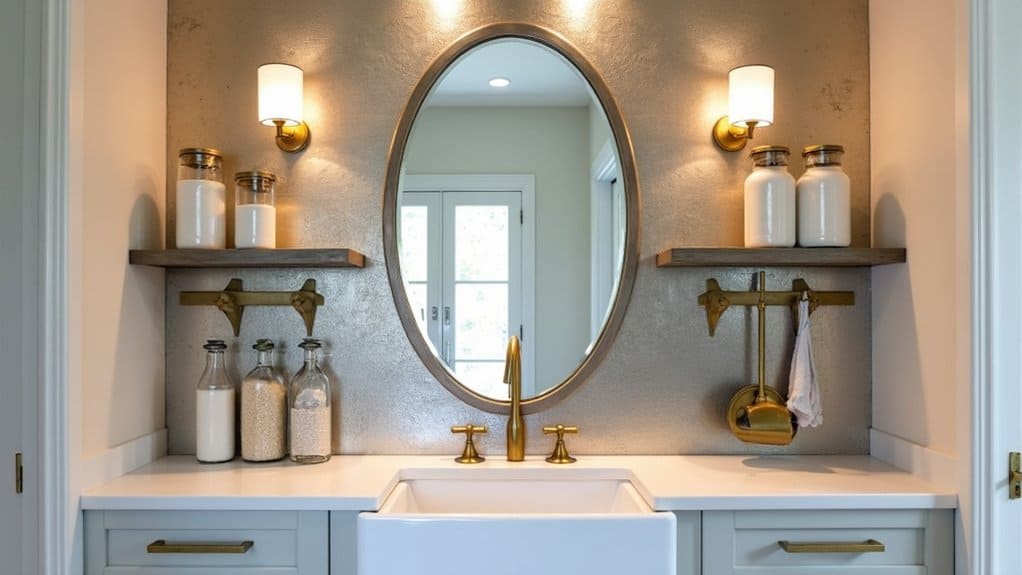 When organizing around an antique mirror backsplash, consider incorporating complementary décor elements like brass or wooden accents to enhance the vintage appeal without overwhelming the space. Use wall-mounted hooks or racks above or beside the mirror for hanging items like lint rollers or small baskets for detergent pods, keeping them accessible yet out of direct view. This approach not only maintains functionality but also guarantees the mirror remains the focal point of the room’s design.