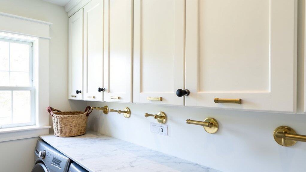 When organizing a laundry room with designer hardware accents, start by selecting high-quality, stylish hardware that complements the room’s overall aesthetic. Opt for cabinet pulls, knobs, and handles in finishes like brushed nickel, matte black, or polished brass to elevate the space from functional to luxurious. Confirm that the hardware matches other fixtures, such as faucets or lighting, for a cohesive and polished look.