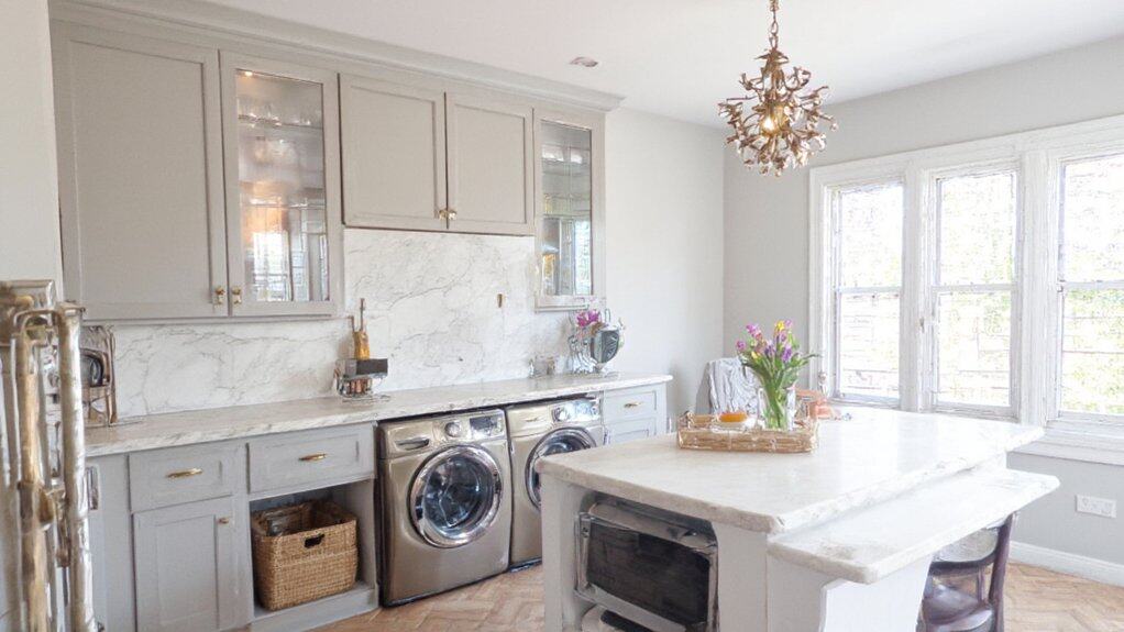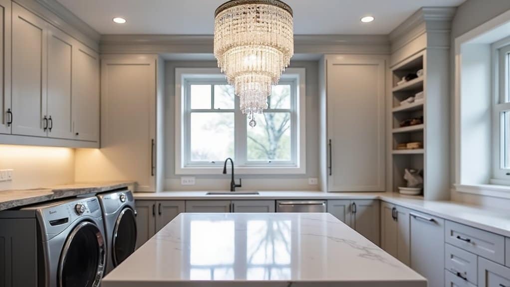 Incorporating a crystal chandelier into a luxury laundry room elevates the space from mundane to magnificent, blending functionality with elegance. Choose a chandelier with a design that complements the room’s overall aesthetic, such as a modern geometric style or a classic tiered crystal piece, guaranteeing it’s proportionate to the room size to avoid overwhelming the area. Position the chandelier centrally or above a key feature like a folding island to create a focal point that enhances the luxurious atmosphere.