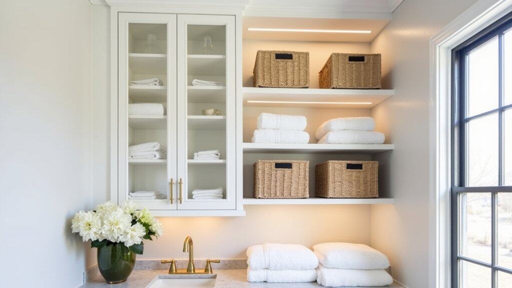 To maximize both elegance and efficiency, integrate shelving with decorative elements such as woven baskets or ceramic jars for storing smaller items like dryer sheets or clothespins. Add a touch of luxury by installing under-shelf lighting to highlight your organized setup and make it easier to find essentials. Ascertain the shelving design complements the overall color scheme and style of the laundry room, creating a cohesive and polished look that feels like an extension of your home’s refined decor.