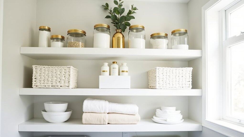 Incorporating gold-trimmed laundry shelves into your space can elevate the aesthetic of your laundry room while providing practical storage solutions. Start by selecting shelves with sleek gold edges or adding gold trim to existing shelves using metallic paint or adhesive strips for a luxurious touch. Verify the shelves are mounted securely on the wall at a height that maximizes accessibility and complements the room’s layout.