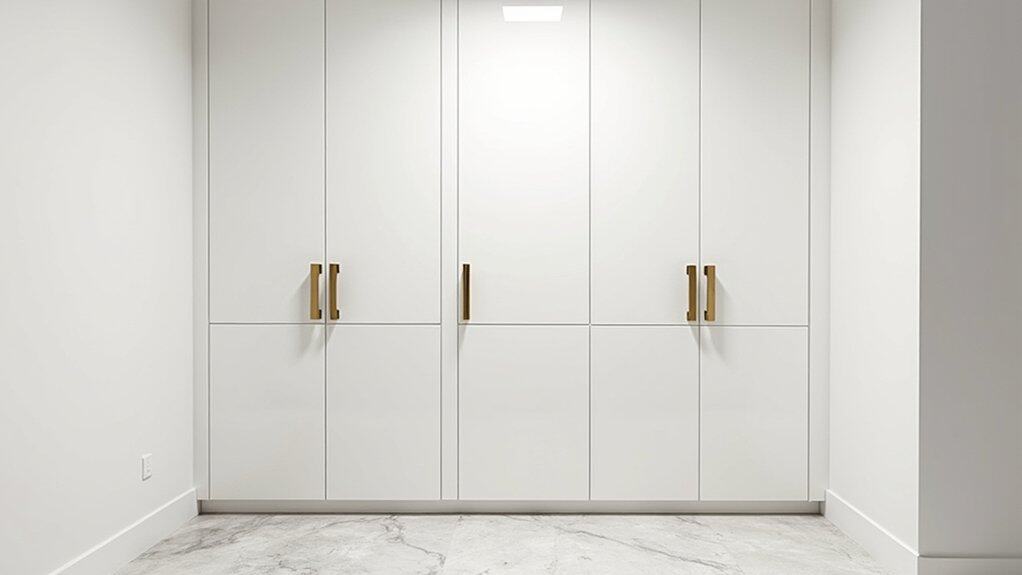 When organizing custom cabinet finishes in a luxury laundry room, start by selecting a finish that complements the overall aesthetic of your home while prioritizing durability. Options like high-gloss lacquer or rich wood stains can elevate the space, adding a touch of sophistication. Make certain the finish is resistant to moisture and cleaning chemicals, as laundry rooms are prone to spills and humidity.