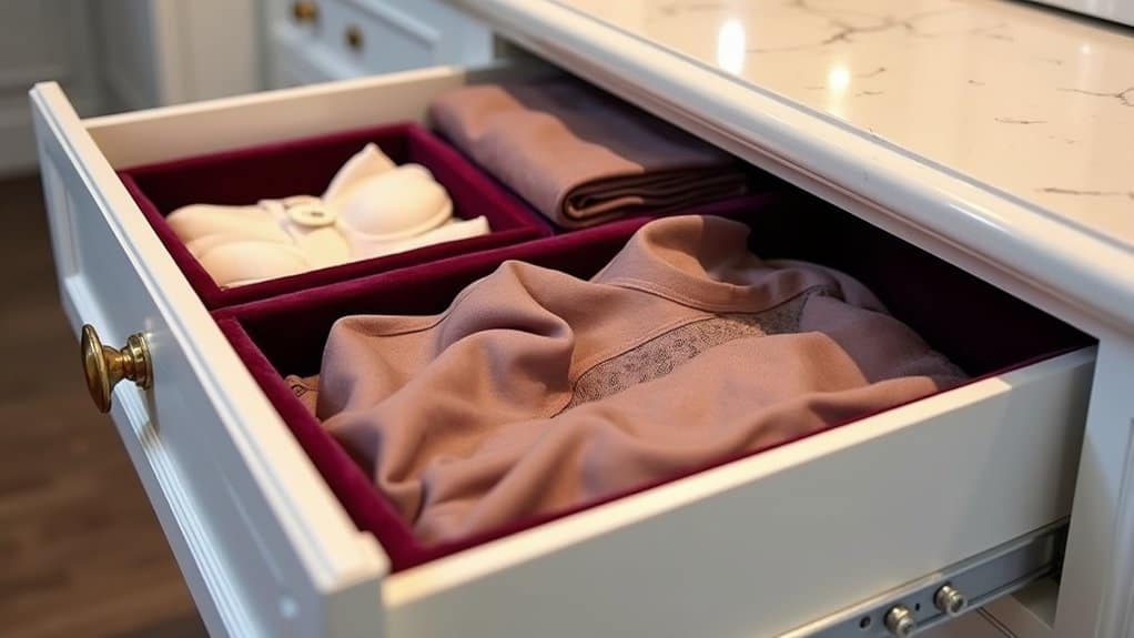 When organizing, categorize items like delicates, socks, or laundry accessories into designated drawers to maintain order and prevent mixing. Use small dividers or organizer trays within the drawers to separate smaller items, making them easy to find. Regularly clean the velvet liners by gently vacuuming or wiping them with a damp cloth to keep the drawers looking pristine and free of dust.