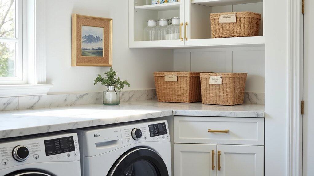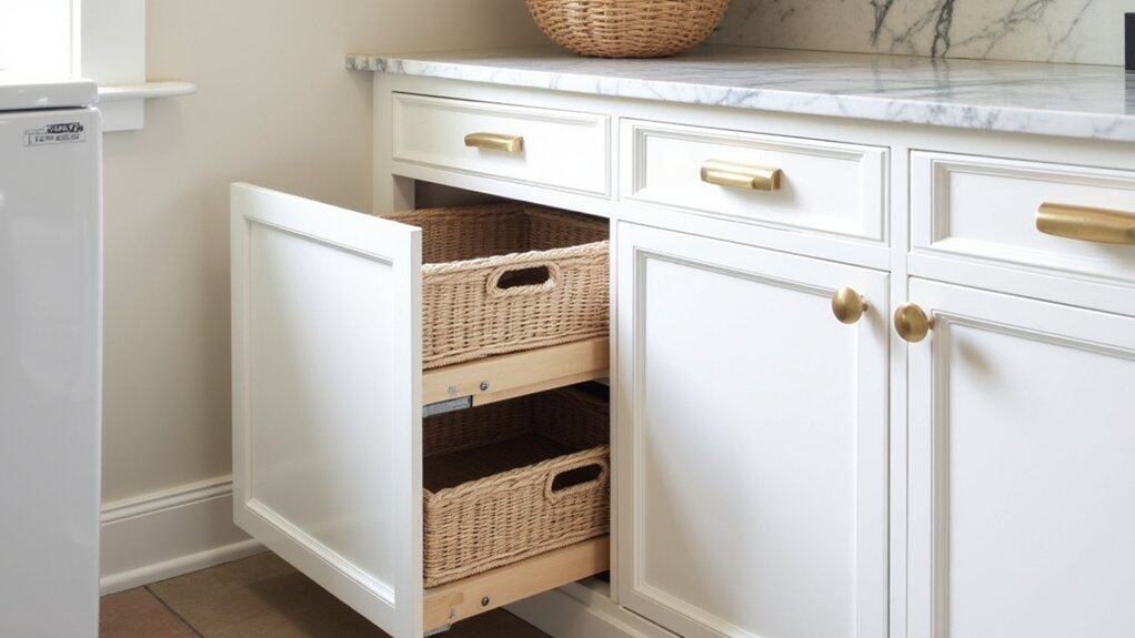 Hidden laundry baskets are a sleek solution for maintaining a clutter-free and luxurious laundry room. By integrating baskets into custom cabinetry or under countertops, you can keep dirty clothes out of sight while preserving the room’s aesthetic appeal. Opt for pull-out drawers or cabinets with built-in hampers that blend seamlessly with the rest of the design, guaranteeing functionality without sacrificing style.
