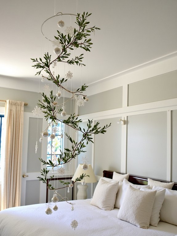 A hanging mistletoe ceiling mobile creates an enchanting holiday focal point by suspending sprigs of both fresh and faux mistletoe from the ceiling using clear fishing line. The arrangement floats gracefully above beds or seating areas, bringing traditional holiday charm to any room.