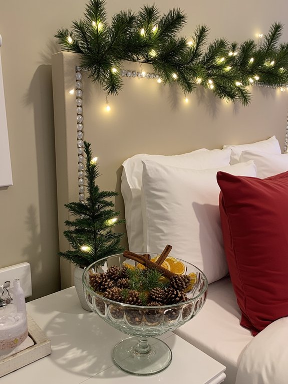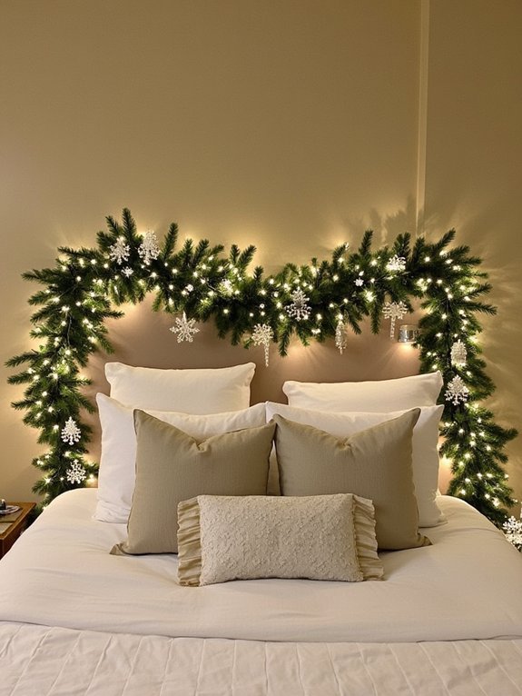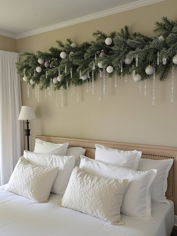 A festive garland wall display can transform bedroom walls into captivating holiday focal points. By mixing materials like pinecones, berries, and evergreen branches, the arrangement creates visual depth and texture while complementing existing room decor.