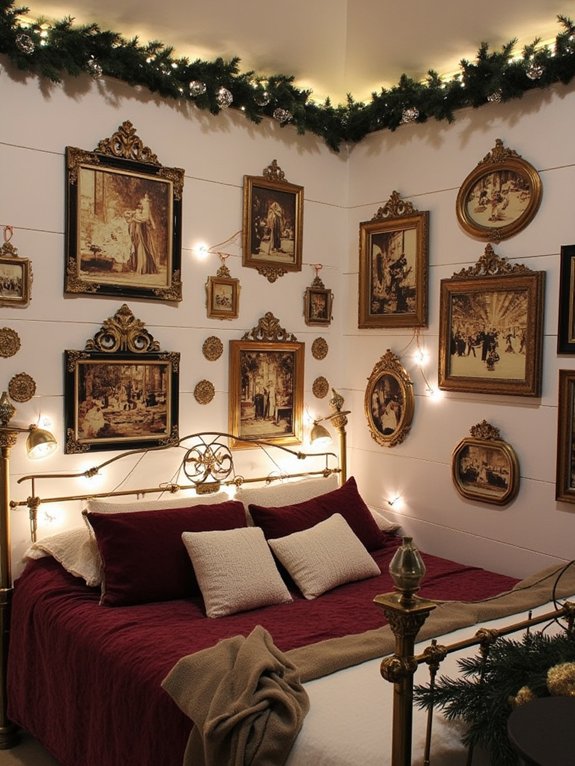 These curated frame collections work best when grouped in small clusters, featuring both color and black-and-white photos. Traditional frames can be updated with metallic spray paint to achieve an antique finish, allowing even simple wooden frames to become part of a sophisticated holiday display.