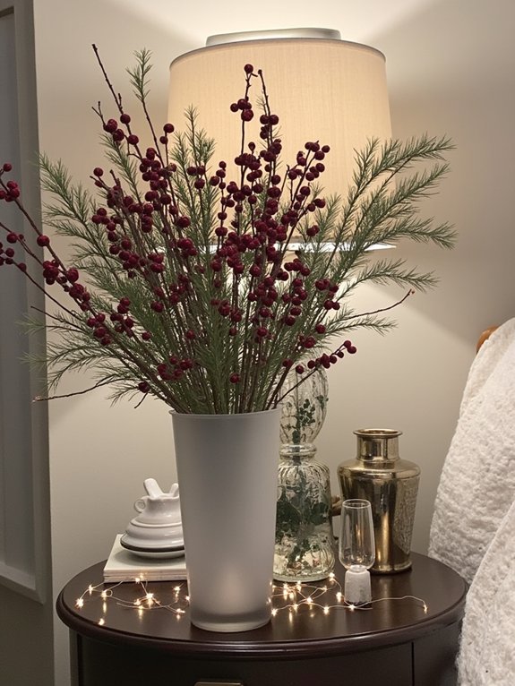 A winter bedside bouquet featuring bright berries creates a festive focal point that brings seasonal cheer to any bedroom. By combining red berries with pine sprigs and white flowers, the arrangement captures the magical essence of winter while adding natural beauty to nightstands and dressers.