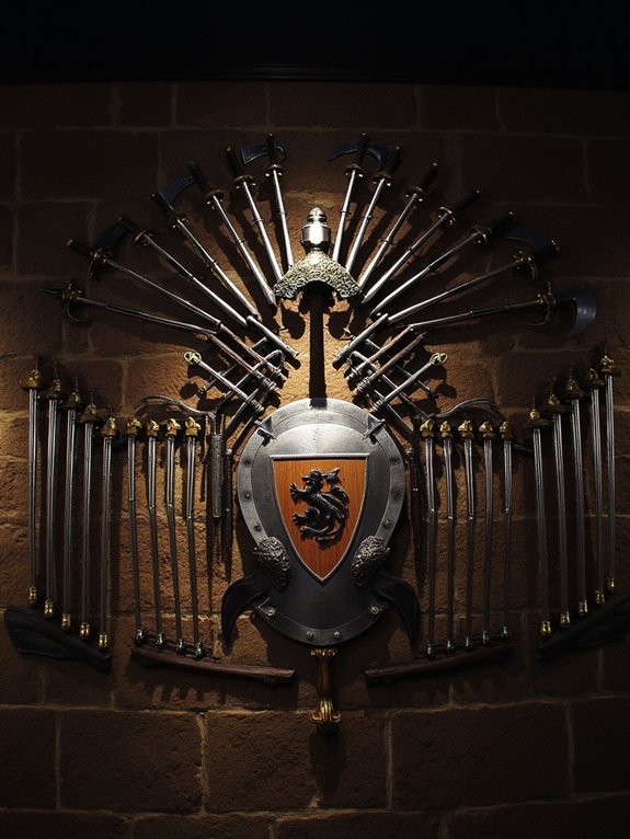 The key to an effective medieval weapons display lies in proper mounting and organization. Using specialized wall brackets for heavier items like broadswords, protective cases for delicate pieces, and chronological arrangement with informative descriptions creates a museum-quality presentation that’s both impressive and educational. All weapons must be securely mounted and positioned safely out of reach.