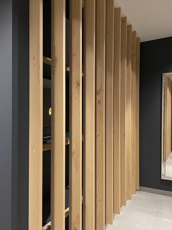 A bamboo accent wall combines natural elements with minimalist design principles to create a striking visual focal point. The installation of vertical bamboo poles at regular intervals produces clean lines while introducing organic texture to the space.