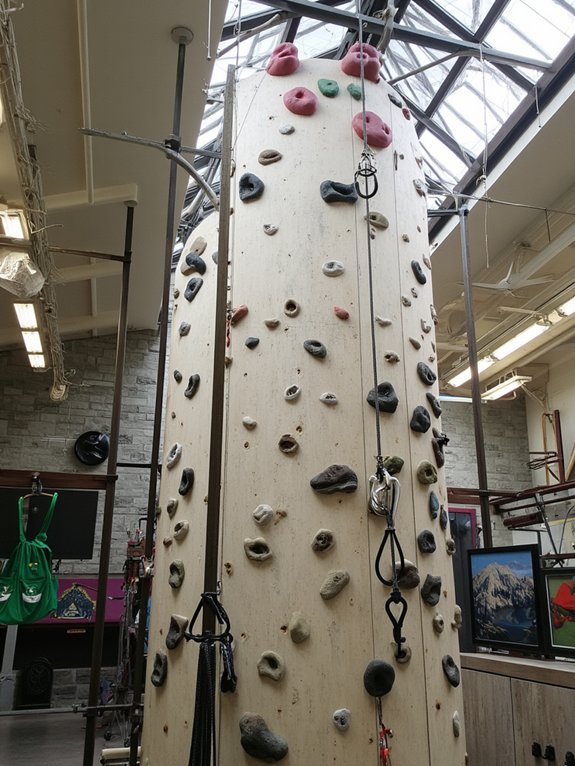 A rock climbing wall creates a striking visual centerpiece that merges functional training with unique décor. Installing colorful holds at varying angles allows climbers to practice diverse techniques while transforming the space into an eye-catching display of climbing gear, including carabiners, ropes, and harnesses mounted on custom racks.