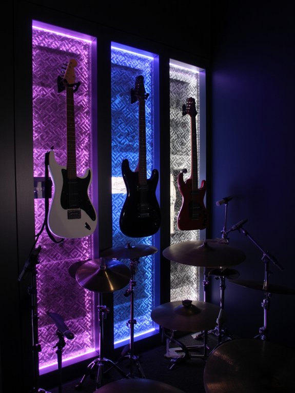 Transform your space into a dynamic music venue with an illuminated stage wall that captures live concert energy. The design combines perimeter LED strip lighting with color-changing capabilities, vintage concert posters, and strategically mounted speakers for optimal sound distribution.