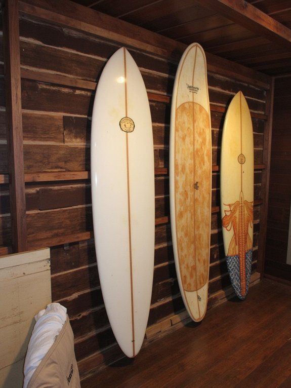 A surfboard rack display offers both practical storage and striking decor for any coastal-inspired space. By mounting wooden or metal racks vertically and positioning boards at a 45-degree angle, you can create an eye-catching focal point that celebrates surfing culture and beach aesthetics.