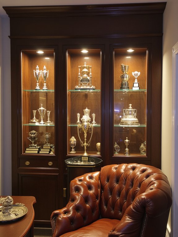 The display should feature adjustable LED spotlights above each shelf, with larger trophies positioned at eye level for maximum impact. Smaller awards can be arranged on floating shelves in ascending order, grouped by type with adequate spacing. A glass cabinet provides protection while maintaining visibility and accessibility for maintenance.