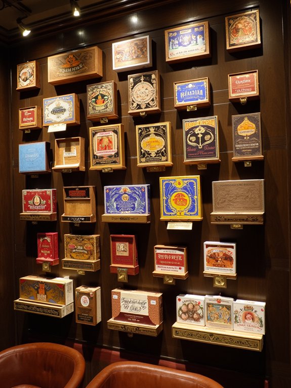 Transform an ordinary wall into a sophisticated display using vintage cigar boxes arranged in patterns. By mounting boxes at varying depths and spacing them strategically, you can create an eye-catching focal point that showcases both the rich history of cigar box art and your appreciation for craftsmanship.