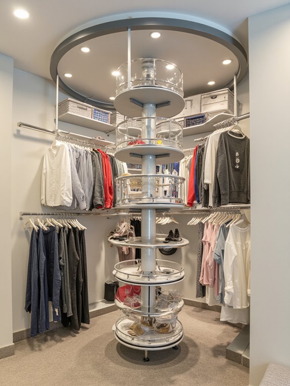 The carousel design is particularly effective for maximizing corner spaces and awkward closet areas. Users can organize clothing strategically, keeping frequent-use items on front-facing sections for quick access while storing seasonal items toward the back, rotating them forward only when needed. This dynamic approach significantly increases storage capacity while improving convenience.
