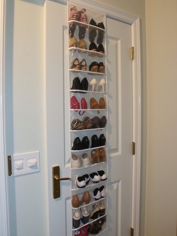 An over-door shoe organizer system turns unused vertical door space into efficient storage. These hanging organizers feature clear plastic pockets that keep shoes visible and easily accessible while freeing up valuable floor space.