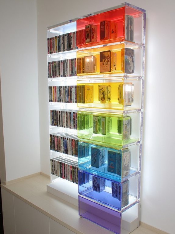 This display method transforms movie collections into decorative wall art while maintaining functionality. Users can easily rearrange their DVDs in various patterns or color schemes, creating dynamic visual displays that complement any room’s decor while maximizing available space with a clean, minimalist aesthetic.