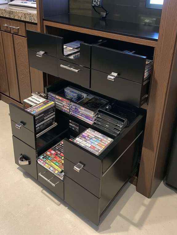Retractable DVD storage drawers combine efficient organization with seamless design by integrating pull-out compartments into existing furniture. These hidden drawers extend fully on smooth slides, providing easy access to stored media while keeping collections dust-free.