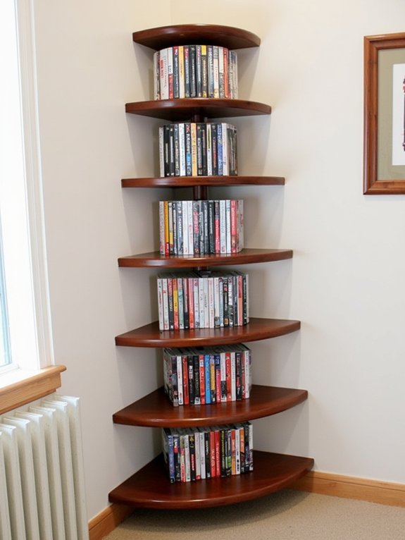 The racks feature adjustable heights to fit various DVD case sizes and can include optional LED lighting for enhanced visual appeal. Whether choosing cascading shelves for a contemporary look or classic wooden designs, these corner units maximize vertical space while keeping collections organized and easily accessible.