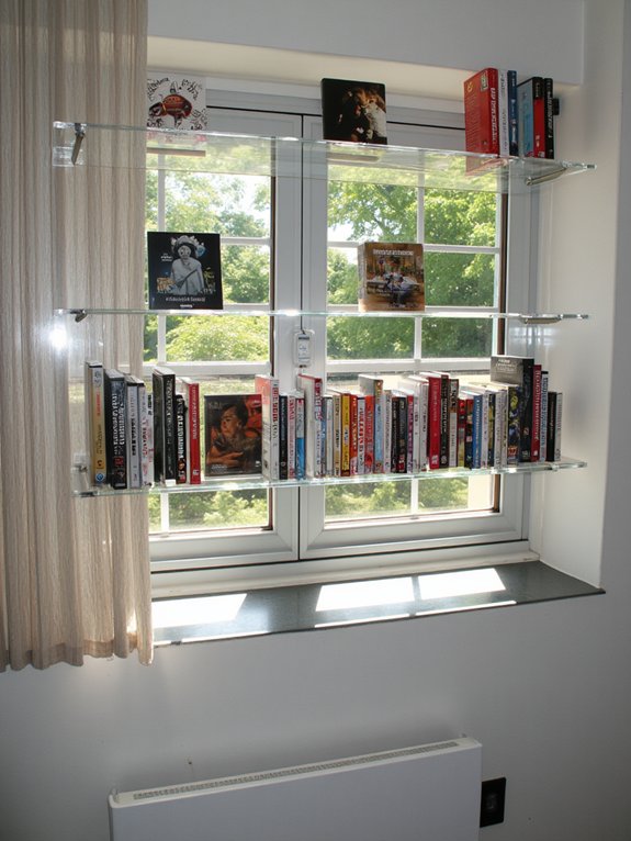 A DVD window storage ledge transforms your windowsill into a functional display area for media collections while maximizing natural light exposure. By mounting adjustable brackets along the window frame, you can create a sturdy shelf that showcases DVDs while making efficient use of vertical space.