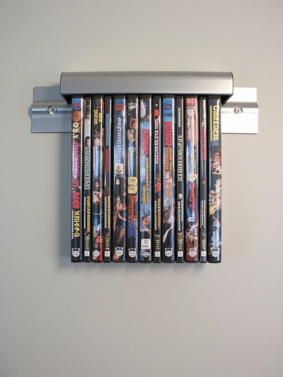 Magnetic wall strips provide a modern and space-efficient way to display DVD collections by creating a floating effect on walls. The system uses vertically mounted magnetic strips combined with metal plates attached to DVD cases, allowing for secure and customizable organization.