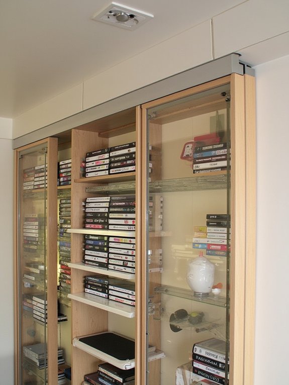 A modular sliding cabinet system maximizes DVD storage through accessibility, space efficiency, and adaptability. The system features adjustable shelving heights and smooth-gliding drawers that protect DVDs from dust while maintaining organization. Custom configurations accommodate various DVD case sizes and allow for easy browsing.