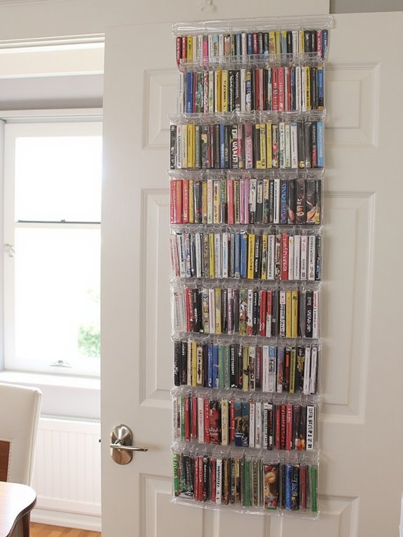 This over-door DVD pocket panel transforms unused door space into organized media storage. The clear vinyl design features 24 reinforced pockets that protect and display DVD cases while allowing easy viewing of titles.