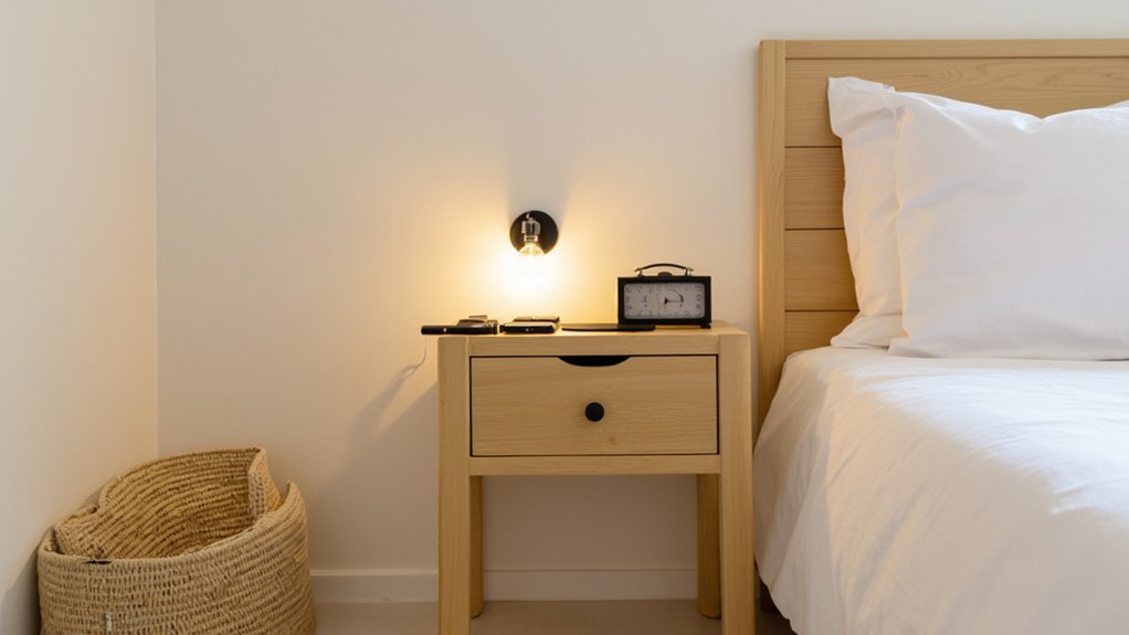 Let’s shift from grounding your space with natural textures to focusing on a calmer bedroom by reducing tech distractions. You’ve got to limit gadgets that disrupt your peace. Keep technology minimal for better rest.