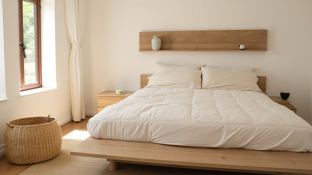 While crafting a minimalist bedroom, incorporating natural texture elements can add warmth without cluttering your space. You can transform your room with simple, earthy touches that soothe the senses. Focus on materials that feel organic and inviting, keeping a clean aesthetic.