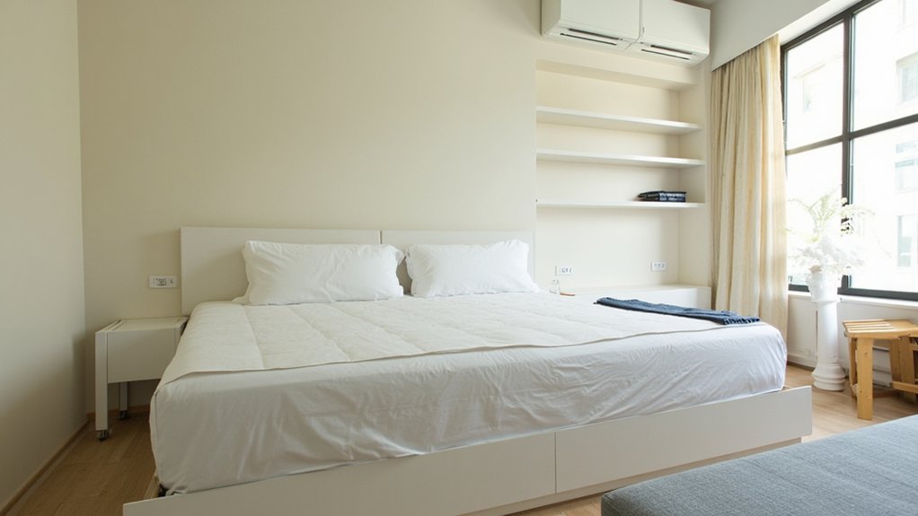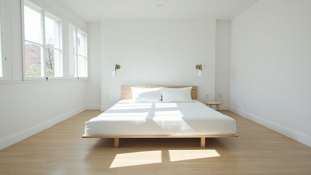 Start transforming your minimalist bedroom by embracing a sparse furniture arrangement for a clean, open feel. You’ll want only essential pieces to avoid clutter. Place your bed against the longest wall, leaving at least 3 feet of walking space around it. Limit yourself to a small nightstand (under 2 feet wide) and skip extra chairs.