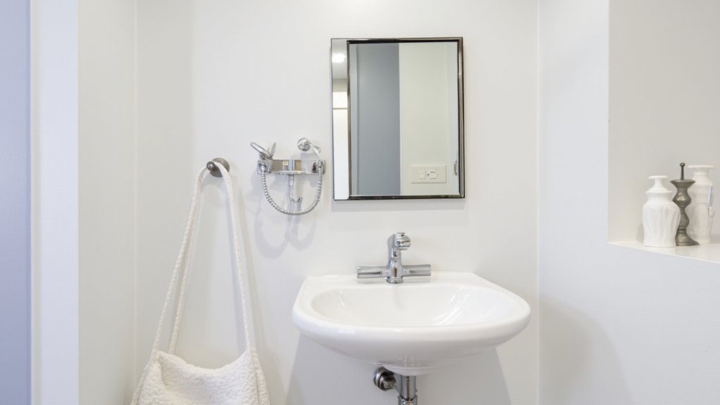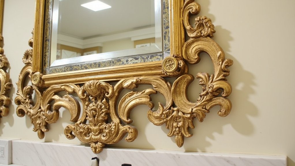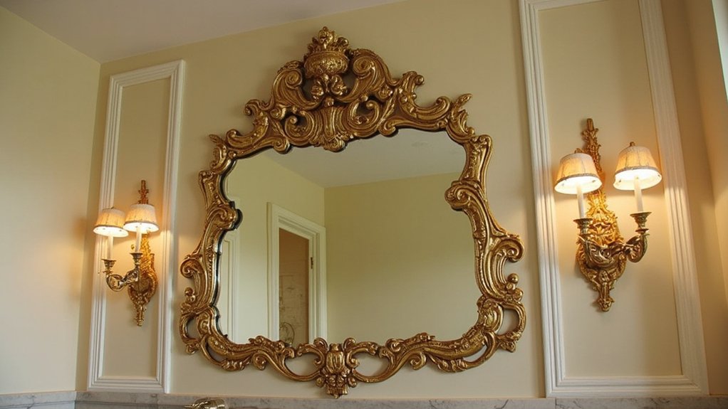 An ornate Baroque mirror can elevate your guest bathroom with timeless elegance and classic style. You’ll love how its intricate gold or silver frames, often 36×24 inches, add a luxurious touch. Hang it above a 30-inch vanity for perfect balance. Installing takes about 30 minutes with basic tools.