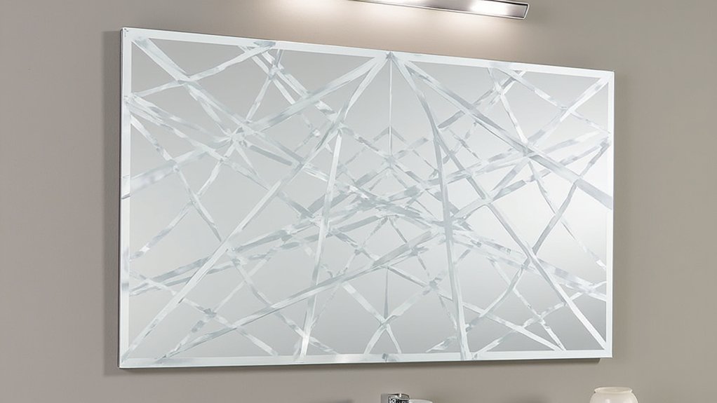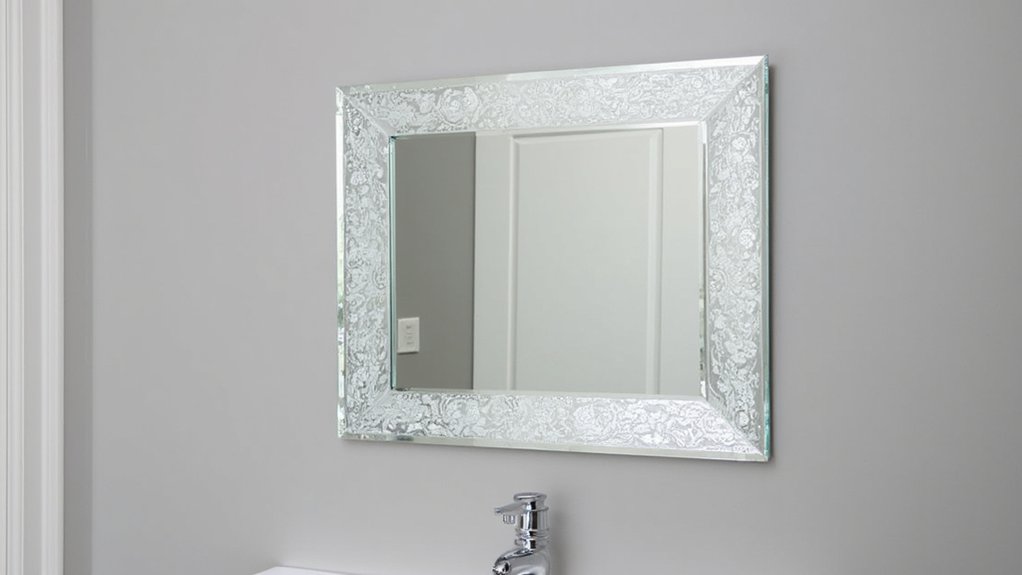 Moving from the dramatic flair of Baroque mirrors, let’s explore the subtle beauty of an etched glass mirror for your guest bathroom. You’ll love how this mirror adds quiet elegance with its frosted designs. Pick a mirror about 24×36 inches to fit most vanities, ensuring it’s installed within a week for a quick update.