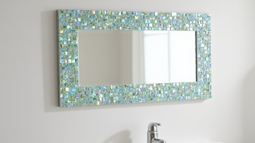 Let’s shift focus to a mosaic border mirror, a striking choice that can elevate your guest bathroom with artistic flair. This mirror, often framed with tiny, colorful tiles, adds a unique touch. You can install a 24×36-inch mirror in just a few hours.